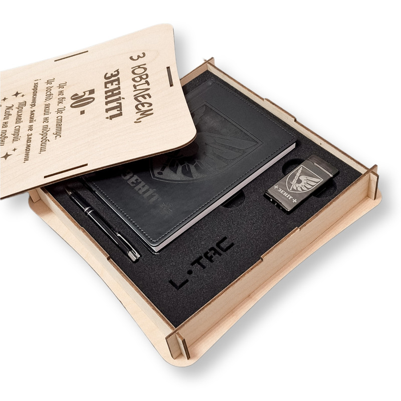 - Блокнот із гравіюванням — стильний записник із твердою обкладинкою, оформлений лазерним гравіюванням. Ідеальний для нотаток, планів, мотиваційних цитат.